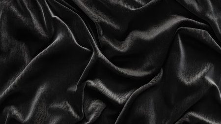 A close-up view of luxurious black satin fabric showcasing elegant waves and soft texture, perfect for fashion, design, and artistic projects.