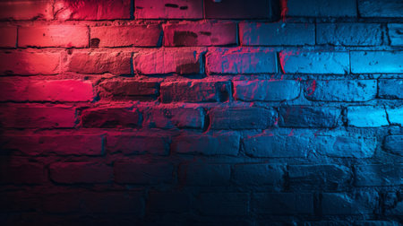 Brick wall illuminated with red and blue neon lights