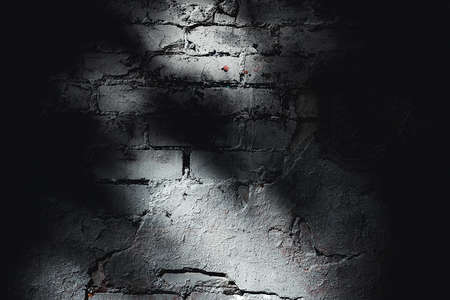 Dramatic shadow of window light casting on the brick wall texture. Copy space. Textured background