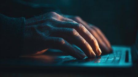 Hands are focused on typing on a laptop keyboard, illuminated by soft light in a dark setting during evening hours.