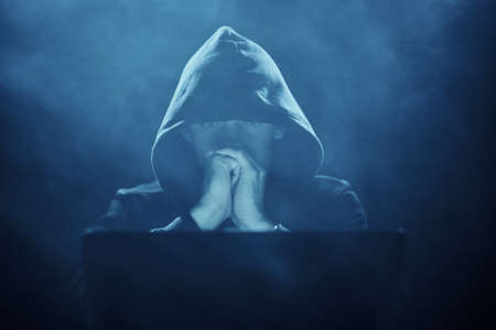 Computer hacker in black mask and hoodie. Obscured dark face. Data thief, internet fraud, cyber security concept.