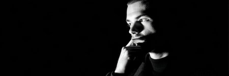 Dramatic portrait of male person with closed eyes on dark background