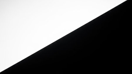 This image presents a minimalist abstract design with a sharp diagonal division. The composition is defined by a stark contrast between black and white, creating dynamic visual interest. It utilizes simple geometric shapes and clean lines that would be suitable for various design projects and commercial applications, such as website backgrounds.