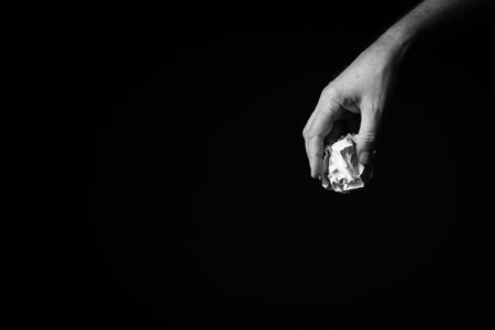 B+W image of male hand holding crumpled ball of paper against black background with dramatic lighting.