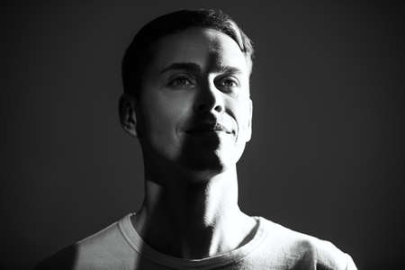 Black and white portrait of a handsome man looking with a calm smile ahead. Dark studio background. Male beauty.