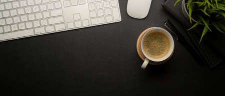 Stylish black office desk top view, flat lay with keyboard, notebook, mug and copy space on black background.