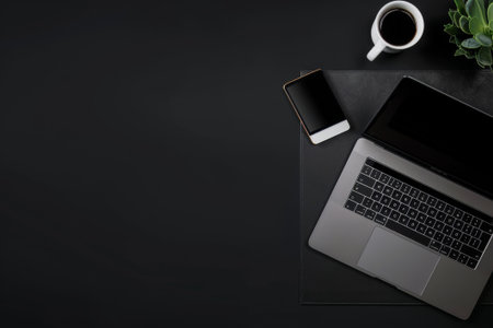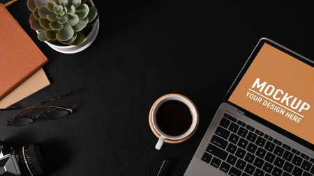 Overhead shot of dark modern workspace with laptop, stationery, coffee cup and copy space on black table