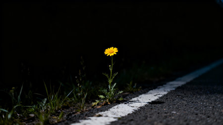 Yellow flower on the side of the road with white line and dark background