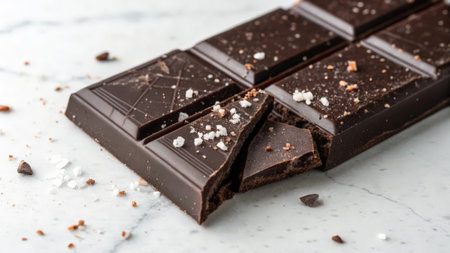 Decadent showing dark chocolate bar with cocoa powder and crumbs in macro focus with bokeh background keywords: chocolate, dark chocolate, bar,...