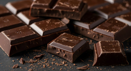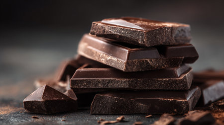 Delicious dark chocolate pieces stacked on a dark textured surface, tempting taste.