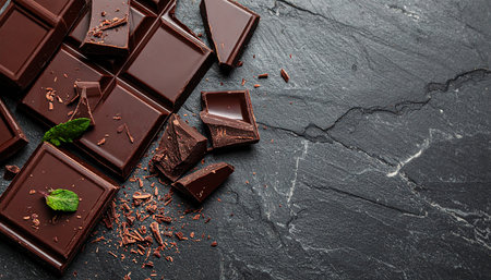 A flat lay of dark chocolate bars and broken shards scattered on a textured black surface, highlighting rich and indulgent details.