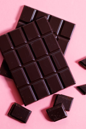 Dark chocolate bars and a small pieces on pink background.