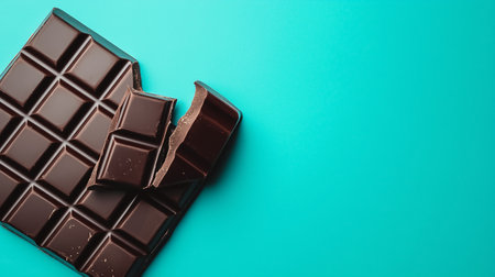 A bar of dark chocolate rests on a vibrant turquoise surface with bites taken out of it.