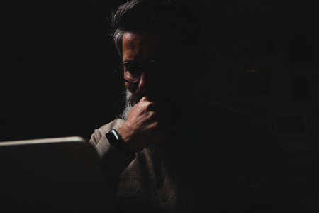 bearded man at a laptop at night. Internet addiction concept