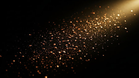 A dark, textured surface is illuminated by a warm spotlight from the upper right, casting a golden glow. The surface is covered with a scattering of small, irregular copper-colored particles and flakes. The light catches the metallic surfaces, creating bright highlights and subtle shadows. The arrangement of the particles is organic and dynamic, forming a visually interesting abstract pattern against the dark background.