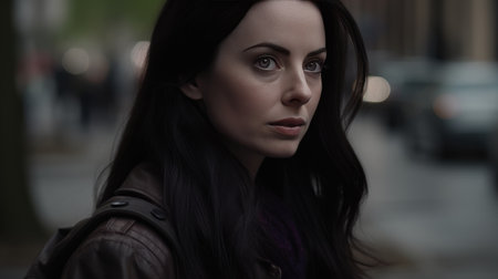 A young woman with striking blue eyes and dark hair looks over her shoulder, her expression thoughtful as she stands outdoors with a blurred cityscape in the background.