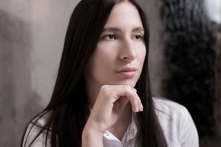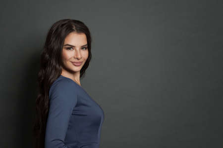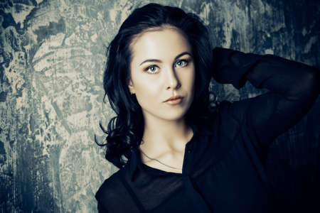 Pretty pale brunette looking at camera with her beautiful dark eyes. Atmospheric portrait of a happy dreaming girl. Blue wall on the background.