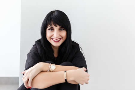 Young Attractive happy brunette woman dressed in a black business suit sitting on a floor in a office, smiling, looking at camera.