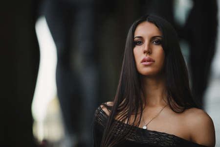 Art portrait of a beautiful girl. gorgeous brunette girl, portrait in night city lights. Vogue fashion style portrait of young pretty beautiful woman with long dark curly hair.