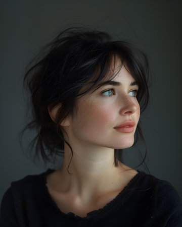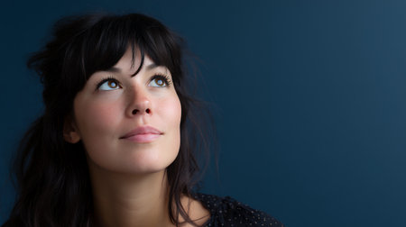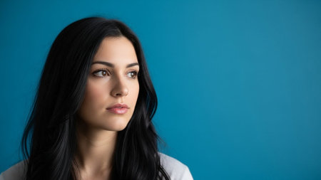 A close-up portrait of a young woman with long dark wavy hair looking thoughtfully to the side against a solid blue...