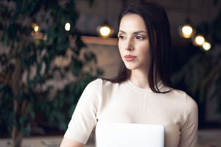 Portrait of a beautiful young woman in a white sweater against the background of the window