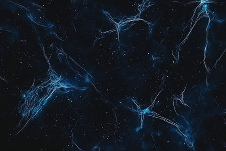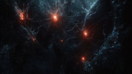 This abstract image illustrates intricate neural networks with bright, glowing nodes, emphasizing connectivity and complexity in a mystifying dark space.