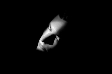 Artistic beautiful woman with long hair looking sexy. Shadow on half face. Closeup art portrait