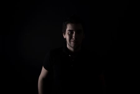Portrait of a young man wearing a black T-shirt. A man in a black classic sweater on a black background. The dark-haired young man. An enigmatic look.