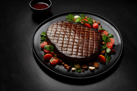 Grilled beef steak with vegetables and sauce on black plate, closeup