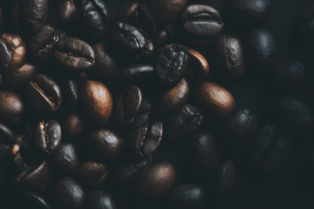 Close-up of roasted coffee beans creating a rich, textured background, ideal for coffee-related themes