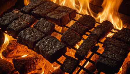 This image captures the essence of grilling with smoky almonds resting on grill bars, showcasing the details of culinary artistry and cooking techniques.