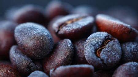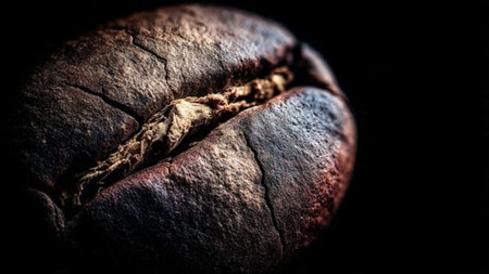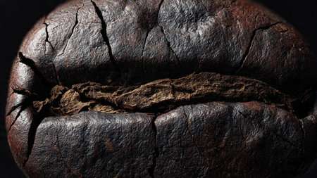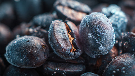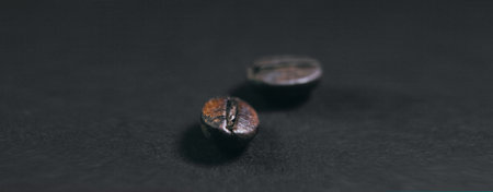 View showing macro close up of roasted coffee beans with rich brown color and detailed texture on dark surface...