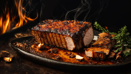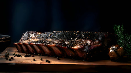 The aroma of smoked beef on a wooden board with herbs filled the air. Creating using generative AI tools