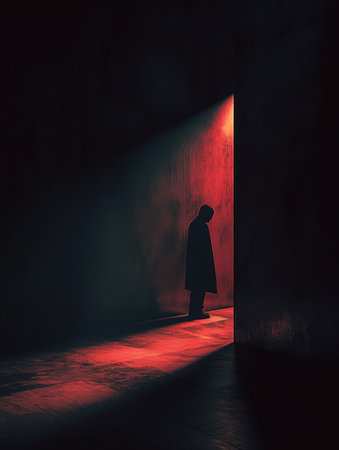 In a dimly lit room, a shadowy figure is caught in a spotlight, surrounded by intense dark and red hues that evoke fear.