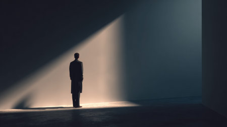 A person pauses in a dimly lit space where light meets shadow, creating a thoughtful atmosphere. The setting is minimalistic and modern.