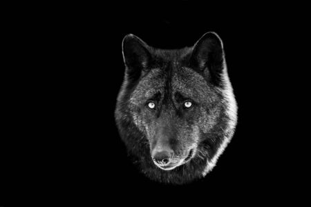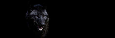Dark wolf with red glowing eyes emerging from shadows, representing danger and mystery. Dark formidable wolf with piercing red eyes