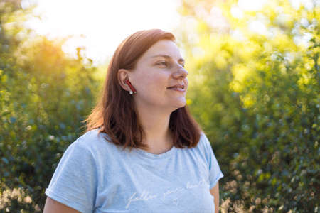 Red haired girl listens to music and enjoys relaxing in the park in the setting sun in summer