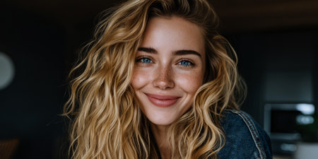 A woman with beautiful curly hair and striking blue eyes smiles warmly. The indoor atmosphere is inviting with soft lighting creating a relaxed vibe.
