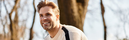 A charming man walks confidently, smiling in a vibrant park on a bright day, exuding joy.