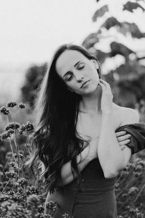 Black and white photo. Portrait girl with long hair with a flower basket. Walk in the flower garden. Girl and flowers. Floristics.