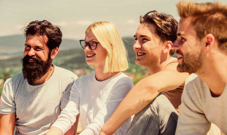 Happy family together. best friends. Summer vacation. happy men and girl relax. group of four people. great fit for day off. diverse young people talking together. Group of people in casual wear