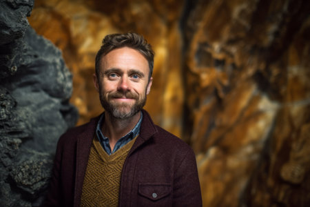 Portrait of a handsome young man with freckles on his face, wearing a brown sweater, outdoors.