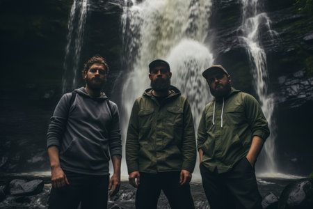 Majestic Moments: Three Adventurers Mesmerized by Waterfalls --ar 3:2