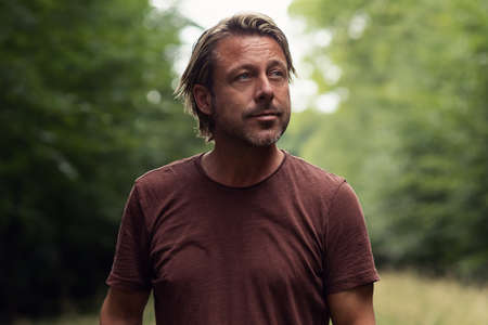 Blonde man with a stubble beard in a lush forest in summer. front view.