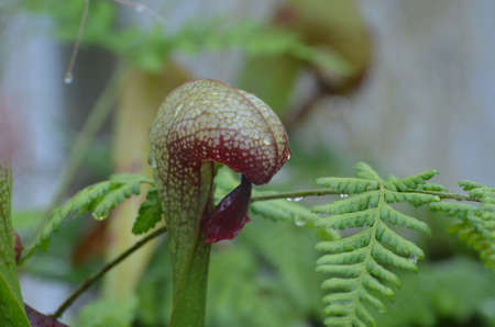Sarracenia carnivorous plant is growinf in garden. Insect consuming plant with leaves as trap.