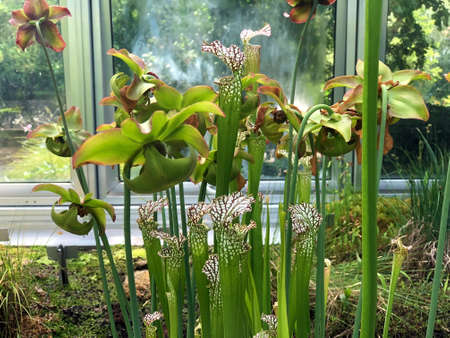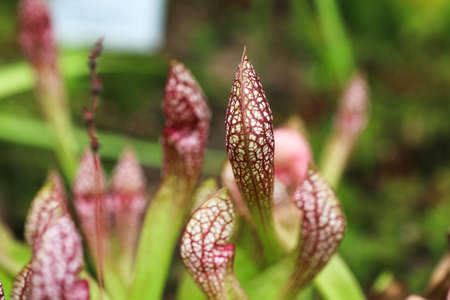 Sarracenia carnivorous plant growing in a botanical garden. Pitcher plant.