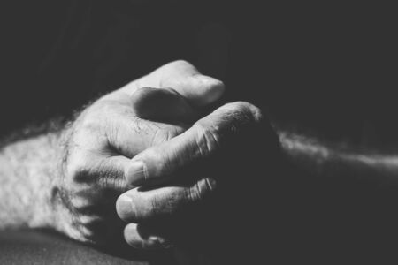 Black & white image of two male hands touching, palms pressed together, isolated against a black background with dramatic lighting.