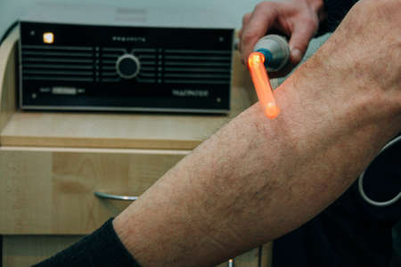 Feet laser therapy. Physiotherapist doctor uses Laser medical equipment for highly effective feet pain treat. Concept of medical orthopedic treatment and rehabilitation