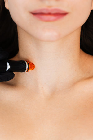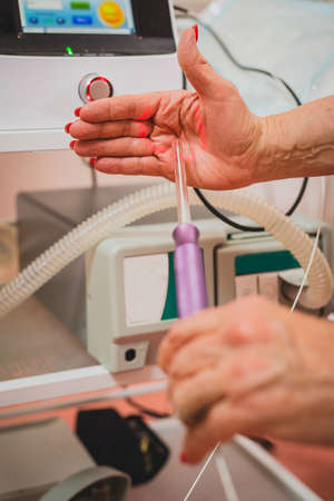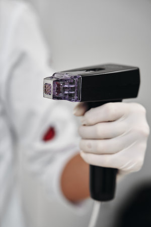 Close-up of a cosmetologist includes a mesotherapy medical device. Close-up of medical equipment in a cosmetology clinic. Skin care.