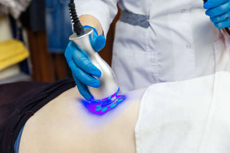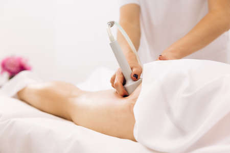Hardware cosmetology. Body care. Spa treatment. Ultrasound cavitation body contouring treatment. Woman getting anti-cellulite and anti-fat therapy in beauty salon